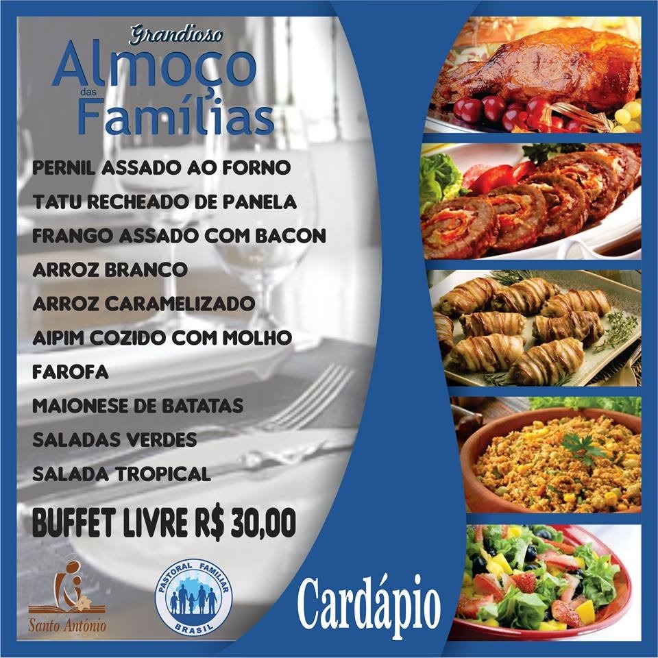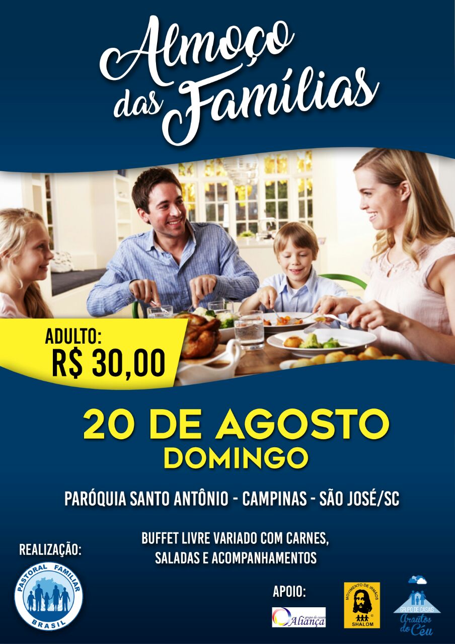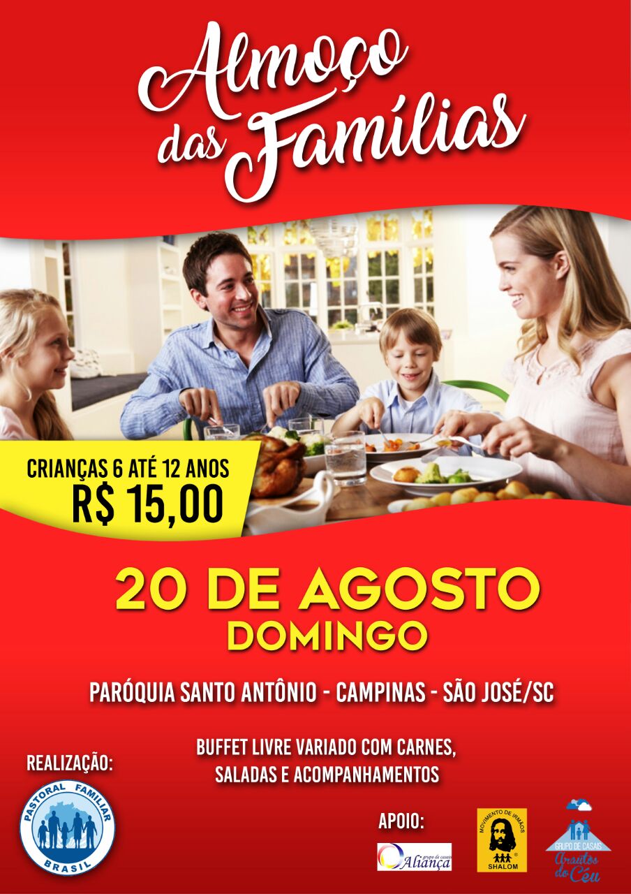 No próximo domingo, 20 de agosto, a Pastoral Familiar da Paróquia Santo antônio, Campinas – São José, com o apoio do Grupo de Casais Aliança, Grupo de Casais Arautos do Céu e Movimento de Irmãos, promovem o grandioso Almoço das Famílias.