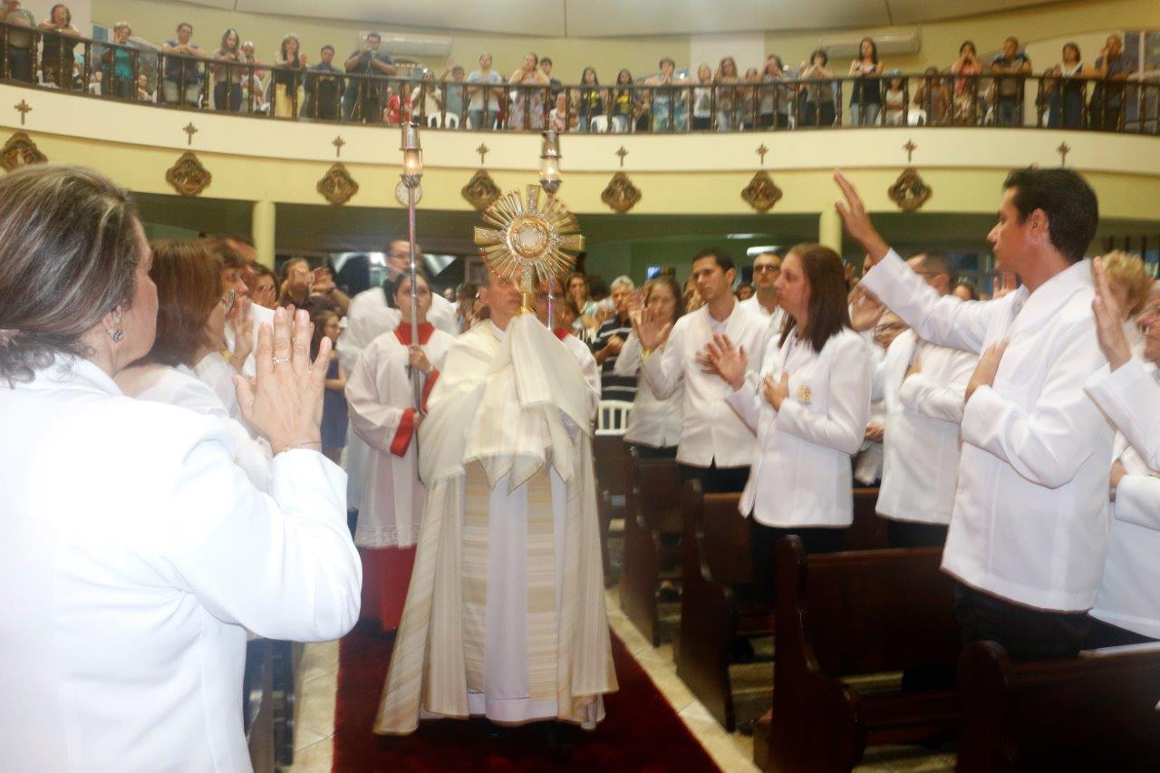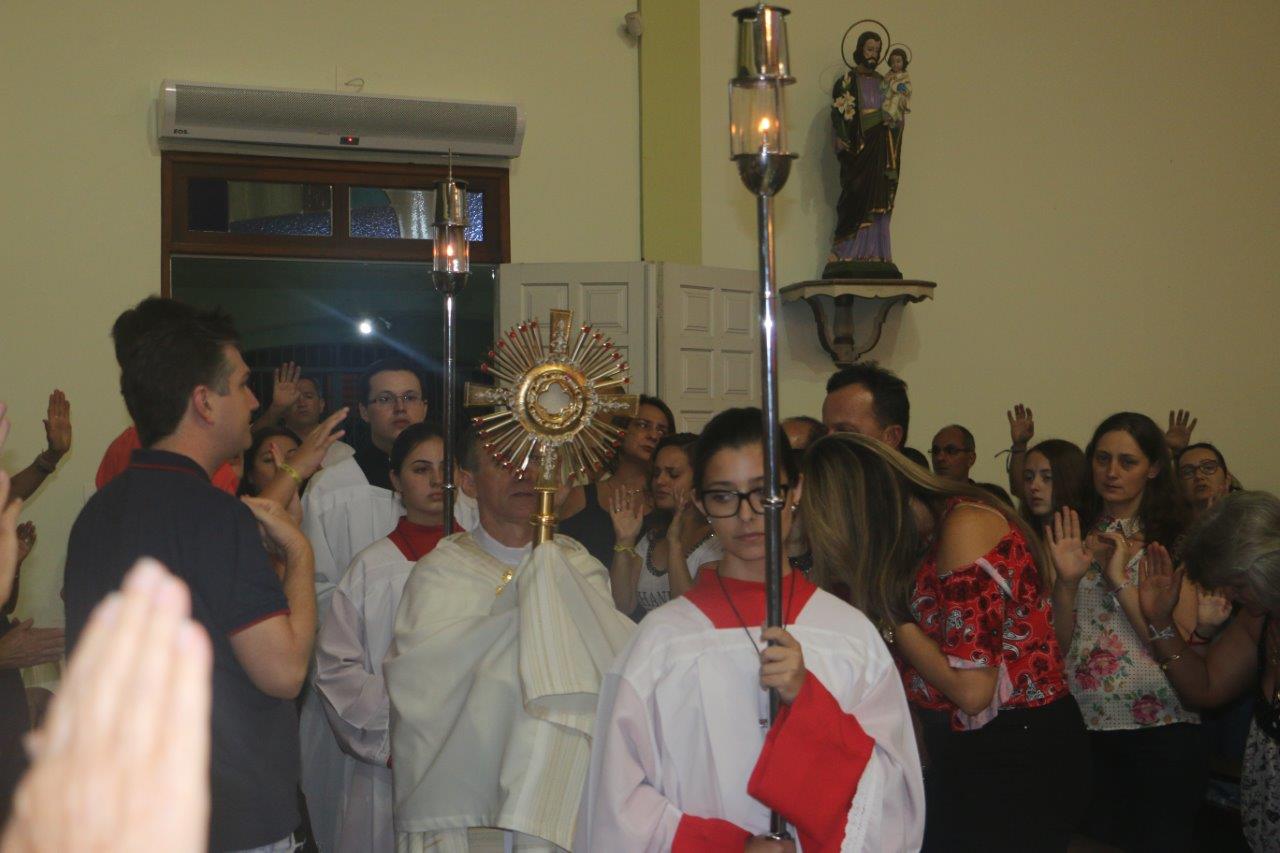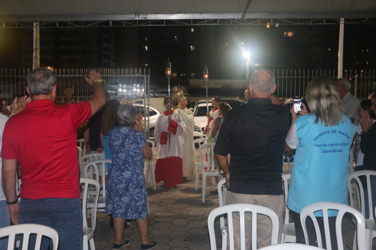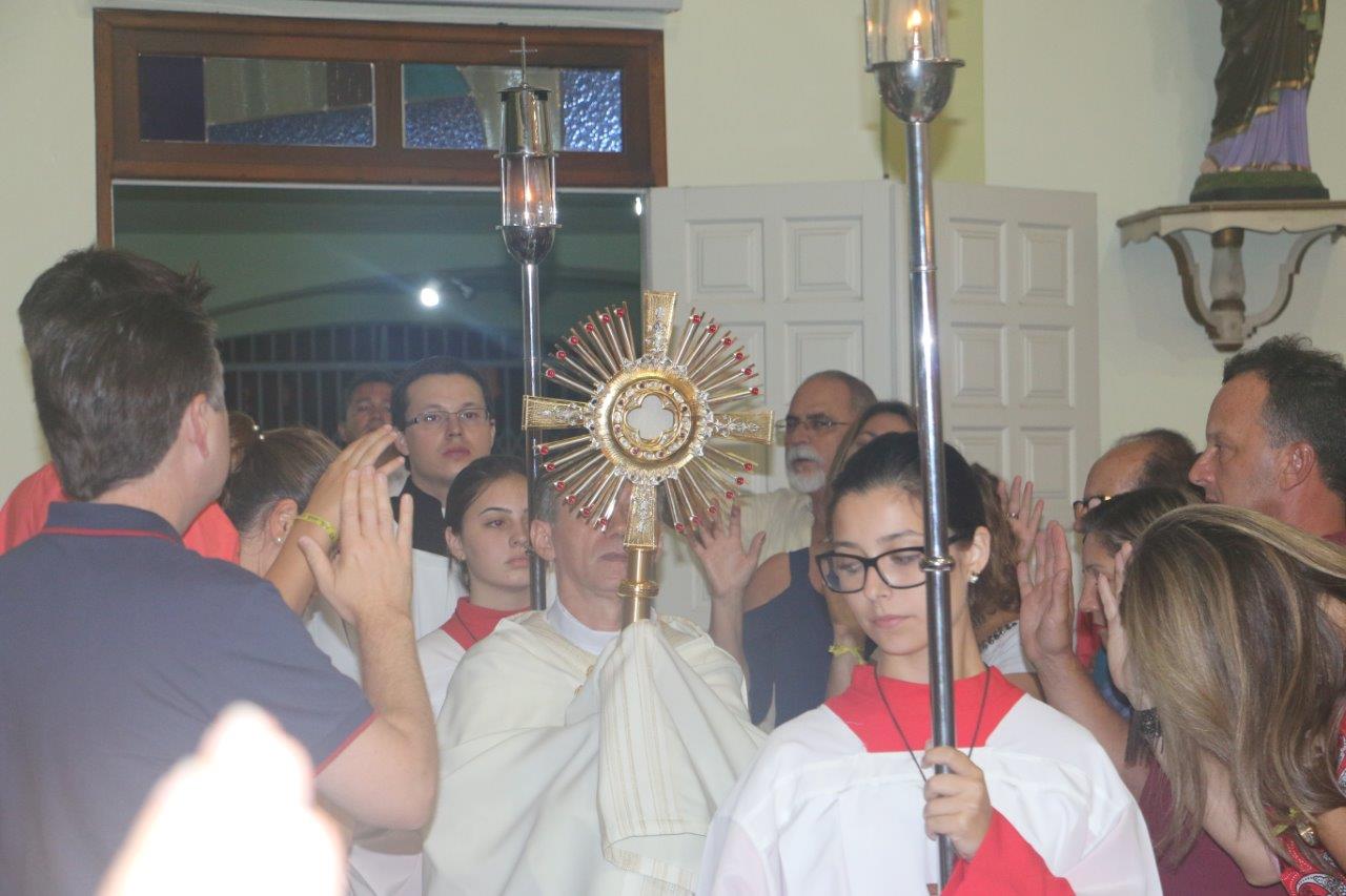 Ao final, Pe. Alcides trouxe o Santíssimo Sacramento para a Adoração de todos e O conduziu por entre o povo, realizando a primeira volta.