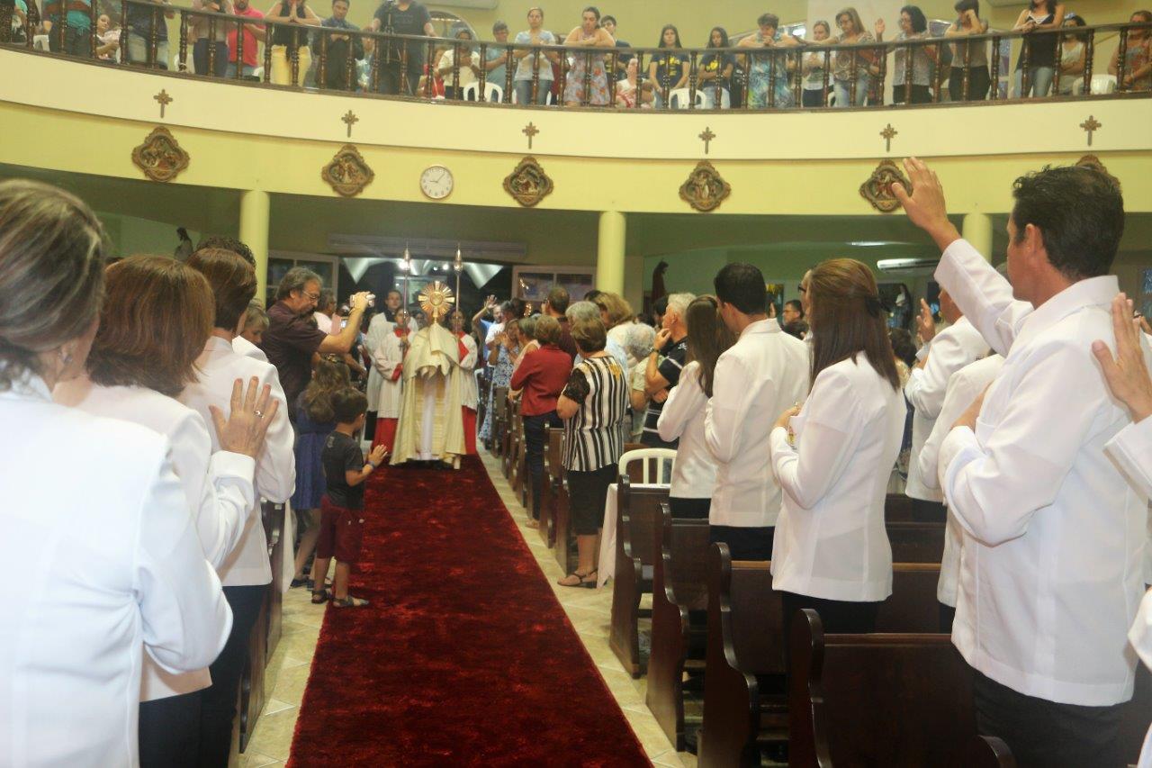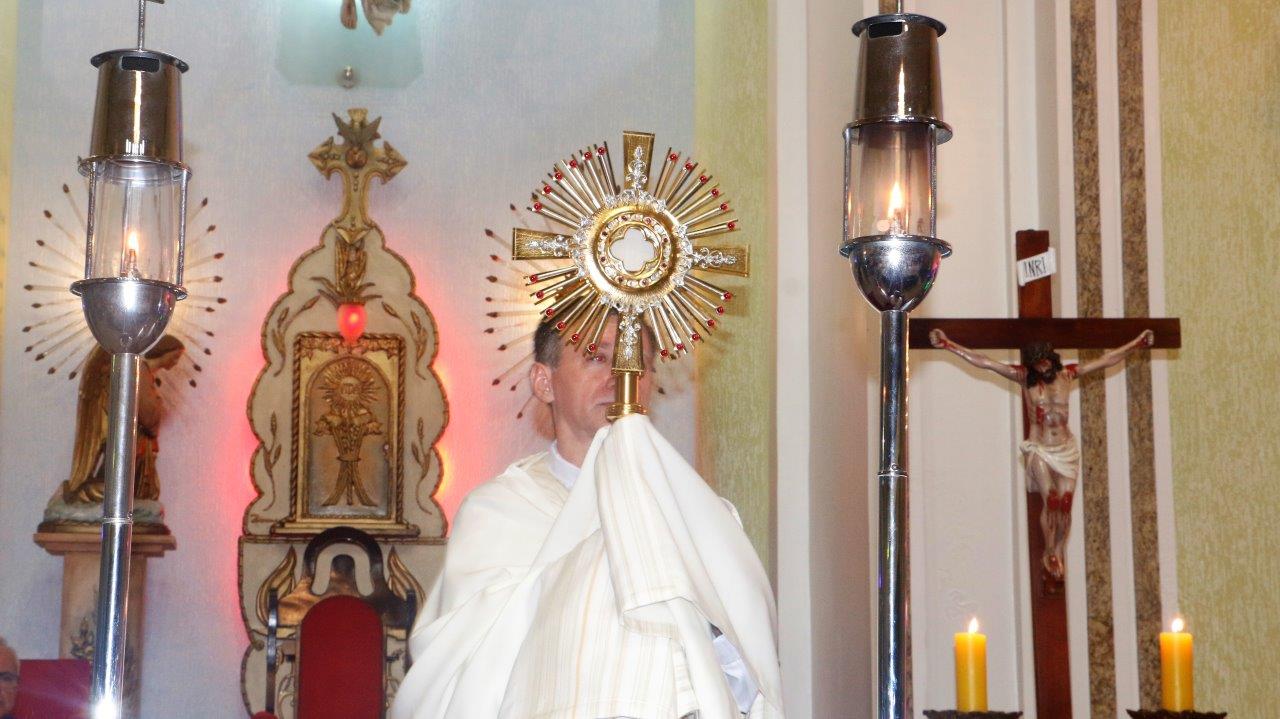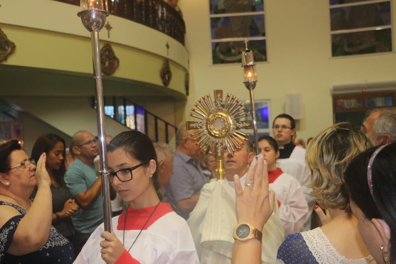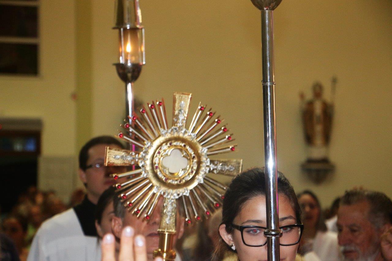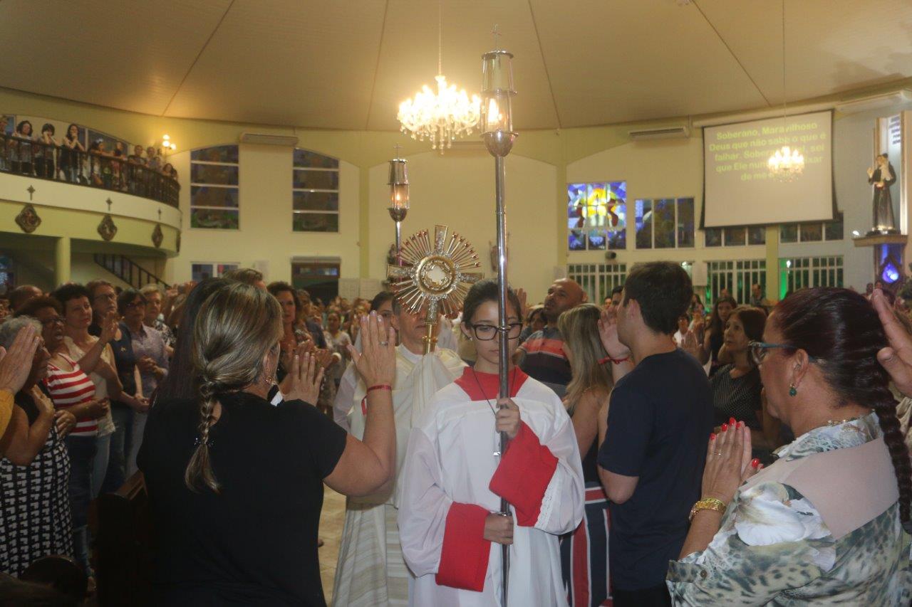 Ao final, Pe. Alcides trouxe o Santíssimo Sacramento para a Adoração de todos e O conduziu por entre o povo, realizando a primeira volta.