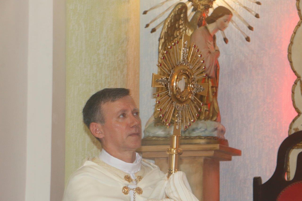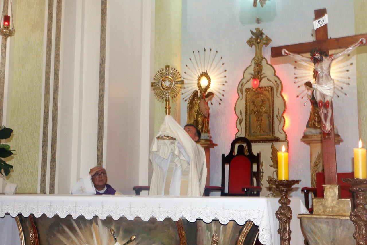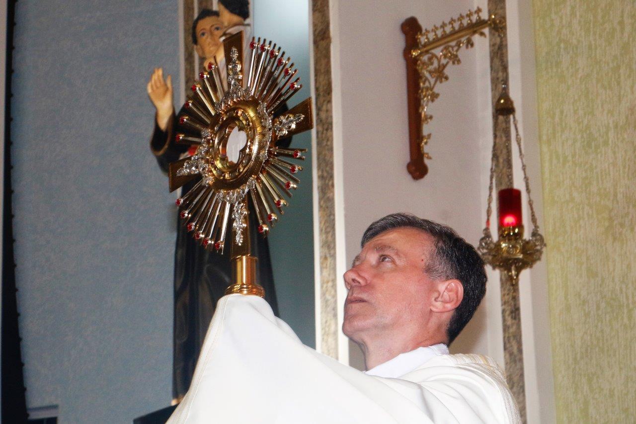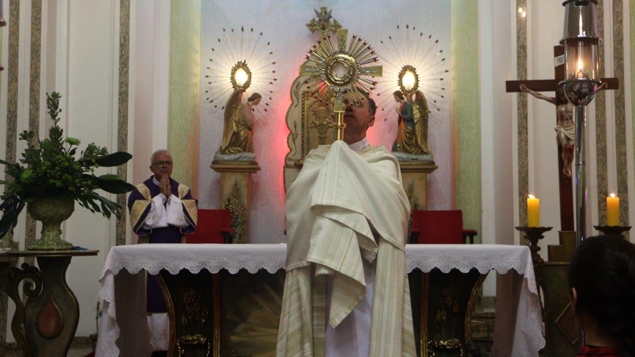 Ao final, Pe. Alcides trouxe o Santíssimo Sacramento para a Adoração de todos e O conduziu por entre o povo, realizando a primeira volta.